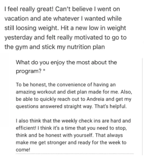 Working with a highly qualified expert in fitness and nutrition for women is not free or cheap. It will require a financial investment. The total investment depends on the type of support and duration of the program. We do however offer payment plans should we decide to work together.